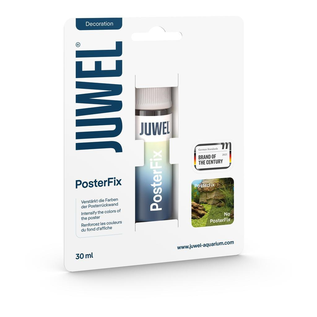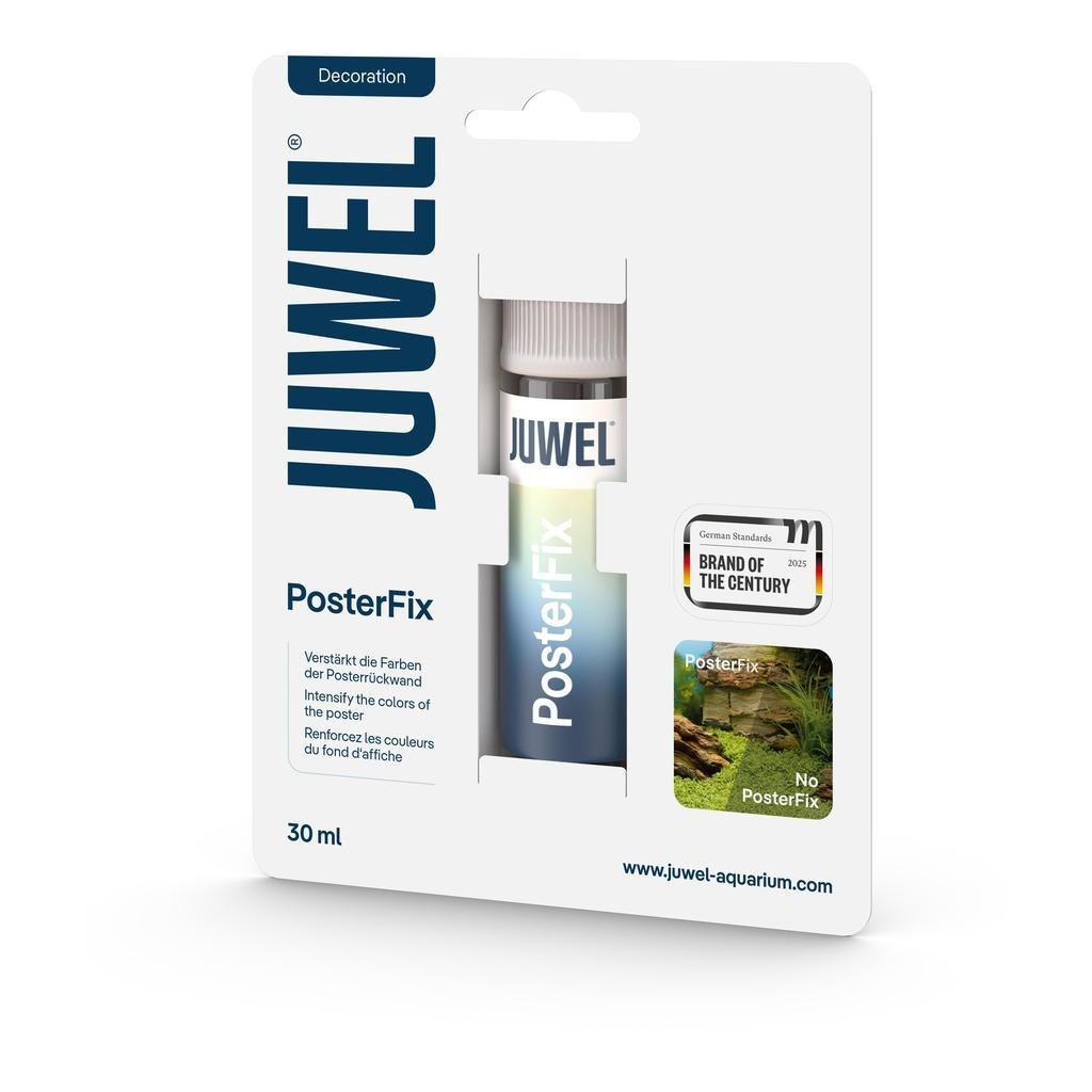 JUWEL Poster Fix to klej na bazie oleju silikonowego pozwalający na montaż fototapety w Twoim akwarium bez widocznych pęcherzyków powietrza. Poster Fix zapobiega nieatrakcyjnemu załamaniu światła, zwiększając w ten sposób kolory i strukturę motywu. Do stosowania na zewnętrznej stronie zbiornika.